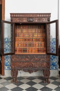 Outro tesouro, que fica logo no salão de entrada, à esquerda, é um móvel que pode passar desapercebido pelos mais apressados. Um armário entalhado, que chegou ao MAB em 2005 por meio de comodato e passou a integrar a exposição “Madeiras do Brasil e os artistas da madeira”, guarda a coleção “Riquezas do Brasil”. Reunida ao longo de décadas pelo médico e colecionador Antonio Berenguer, natural de Santo Amaro da Purificação, a coleção reúne cerca de 600 amostras de madeiras brasileiras moldadas em formato de pequenos livros.