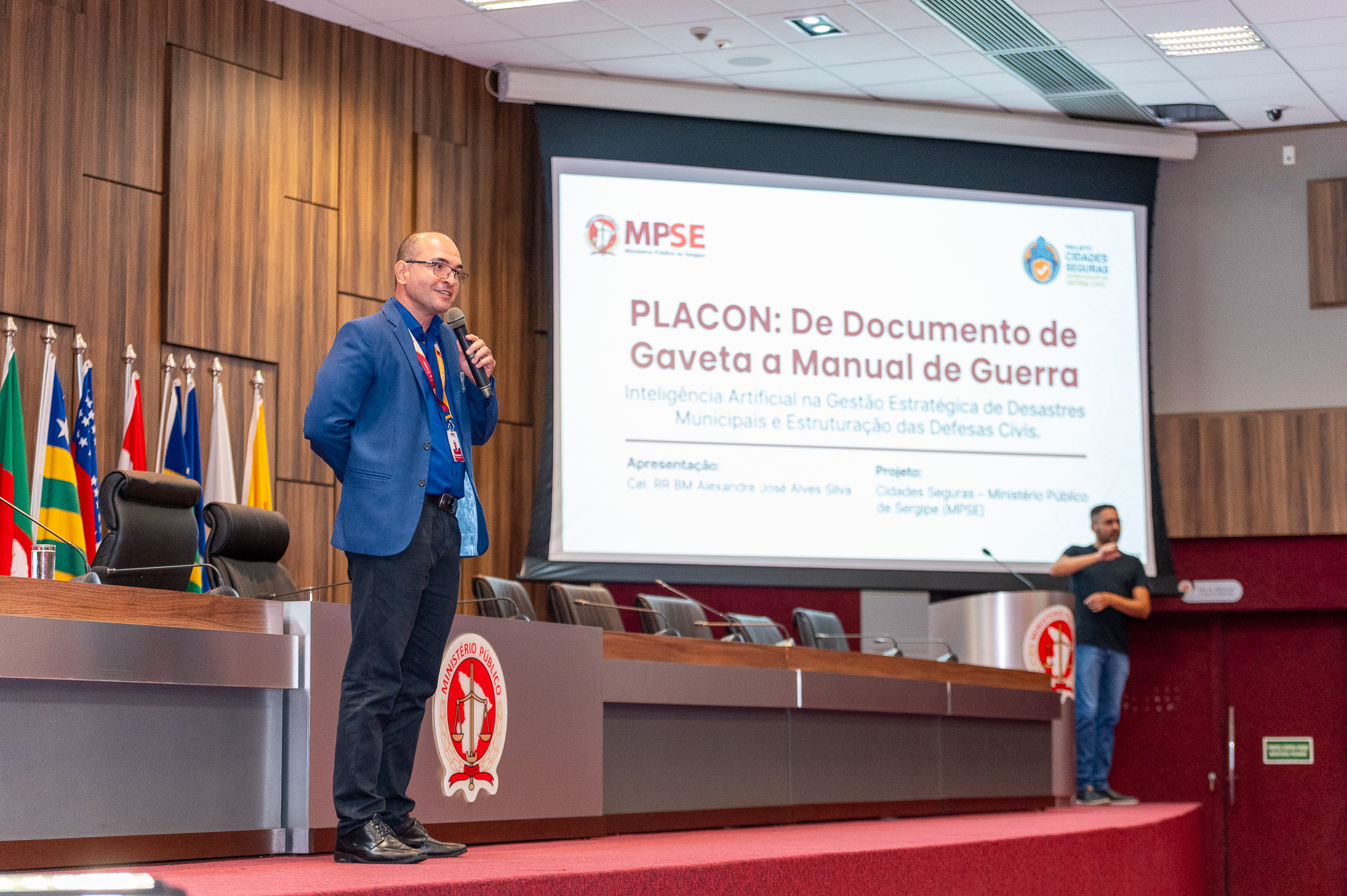 Um ponto importante do Seminário foi a apresentação de uma ferramenta de Inteligência Artificial desenvolvida pelo MPSE com o auxílio da SPDEC. “Esse projeto objetiva contribuir na elaboração e auditoria dos Planos de Contingência de todos os municípios sergipanos, a fim de que esses planos sejam fidedignos à realidade local com maior precisou”, detalhou o Assessor Técnico Administrativo do MPSE, Cel RR Alexandre José Alves.